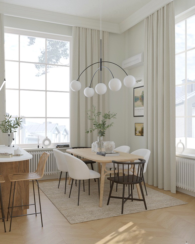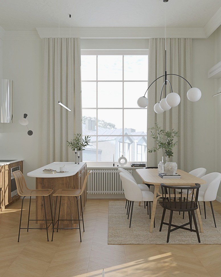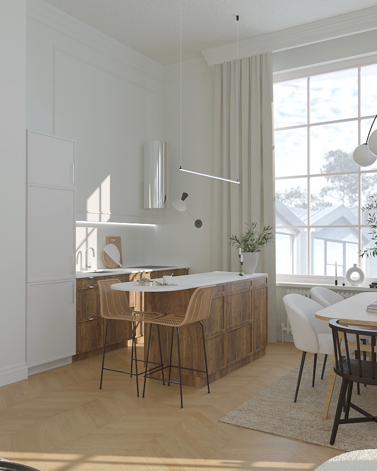 Mieszkanie w kamienicy urządzone w stylu klasycznym. Sztukateria, okna ze szprosami, dekoracyjne oświetlenie oraz plecionka wiedeńska tworzą spójną i elegancką całość. Wszystkie te elementy sprawiają, że wnętrze jest jednocześnie nowoczesne i pełne klasy, z subtelną nutą przeszłości idealnie wpisującą się w charakter kamienicy.