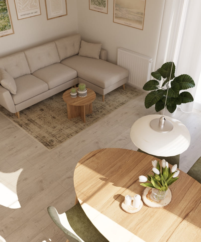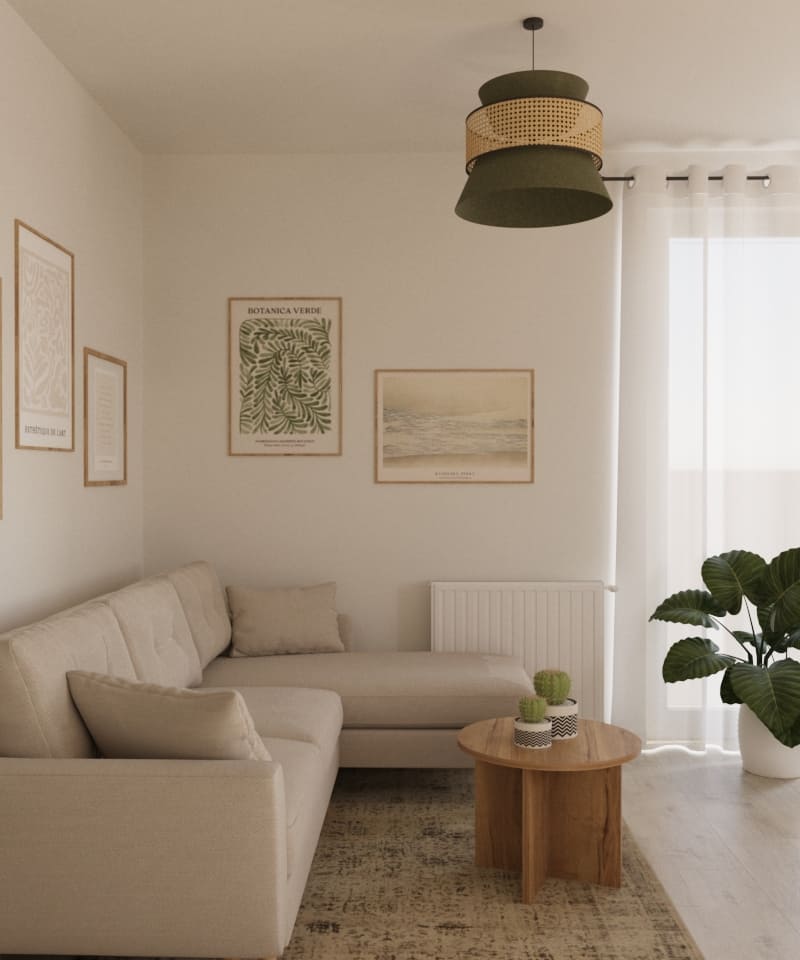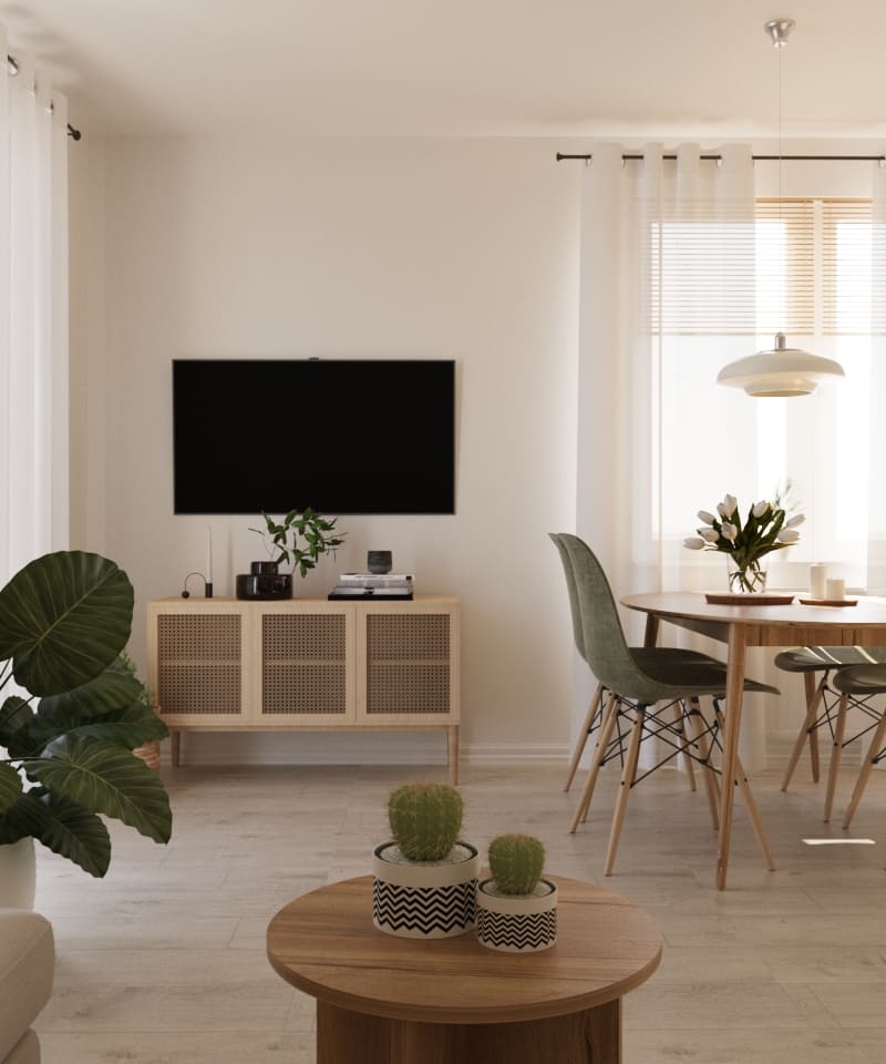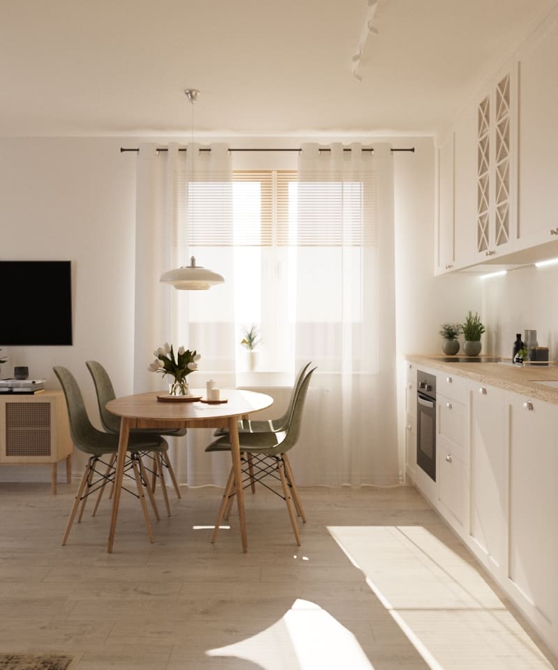 Niektóre wnętrza potrzebują jedynie odrobiny dopieszczenia, aby stały się zupełnie inną przestrzenią do życia. Ta strefa dzienna była monochromatyczna, nieco surowa w odbiorze i pozbawiona głębi. Klienci poprosili mnie o ożywienie tej przestrzeni — bazą była już istniejąca kuchnia oraz podłoga. Czasem wystarczy dodać firany, żaluzje czy wprowadzić inny odcień drewna, aby wnętrze nabrało charakteru i stało się zdecydowanie piękniejszym, bardziej przytulnym pomieszczeniem.