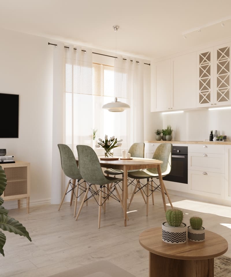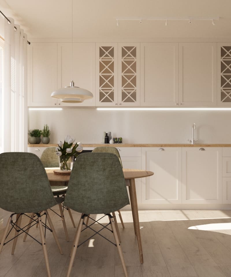 W pomieszczeniach opartych na jasnej bazie nie bójmy się wprowadzać kontrastów. Doskonałym przeciwieństwem jasnej podłogi może być ciemniejszy odcień drewna stołu lub komody. W jasnej kuchni świetnie prezentuje się ciemny piekarnik, dlatego warto powielić ten schemat i „zagrać” tym kolorem również w innych elementach, takich jak karnisz czy drobne detale przy krzesłach. To właśnie kontrast nadaje wnętrzu charakter i wyrazistość.