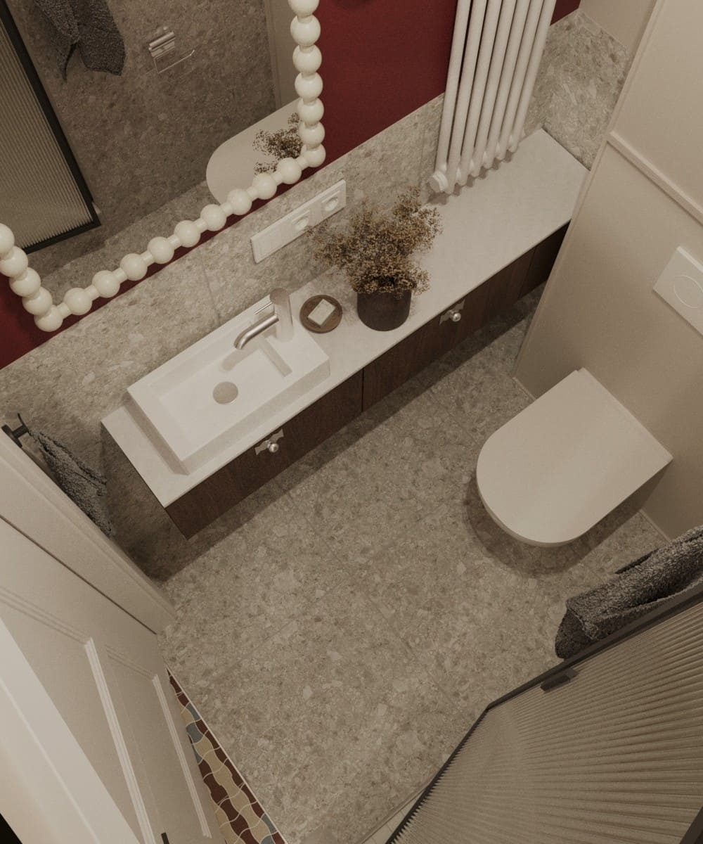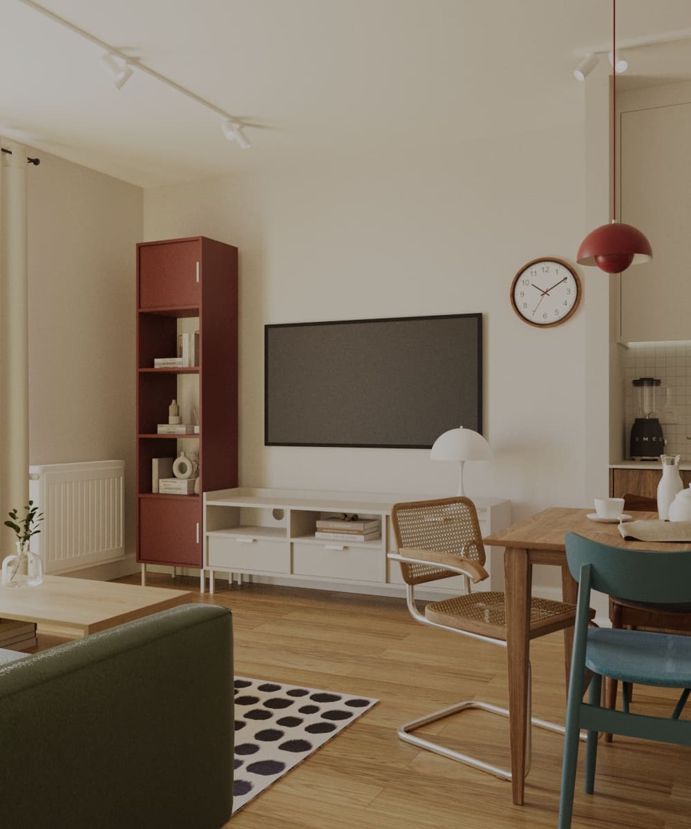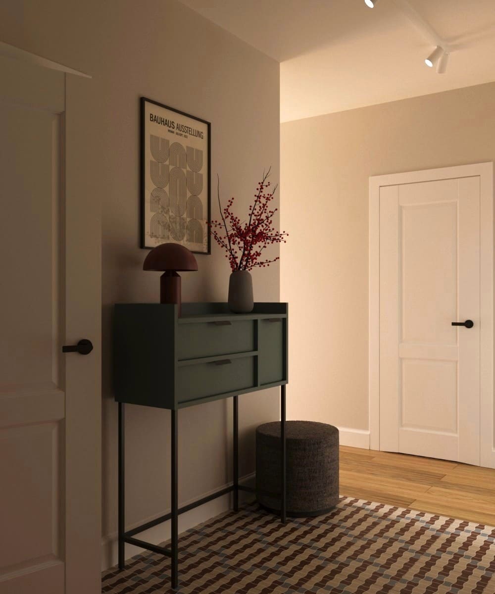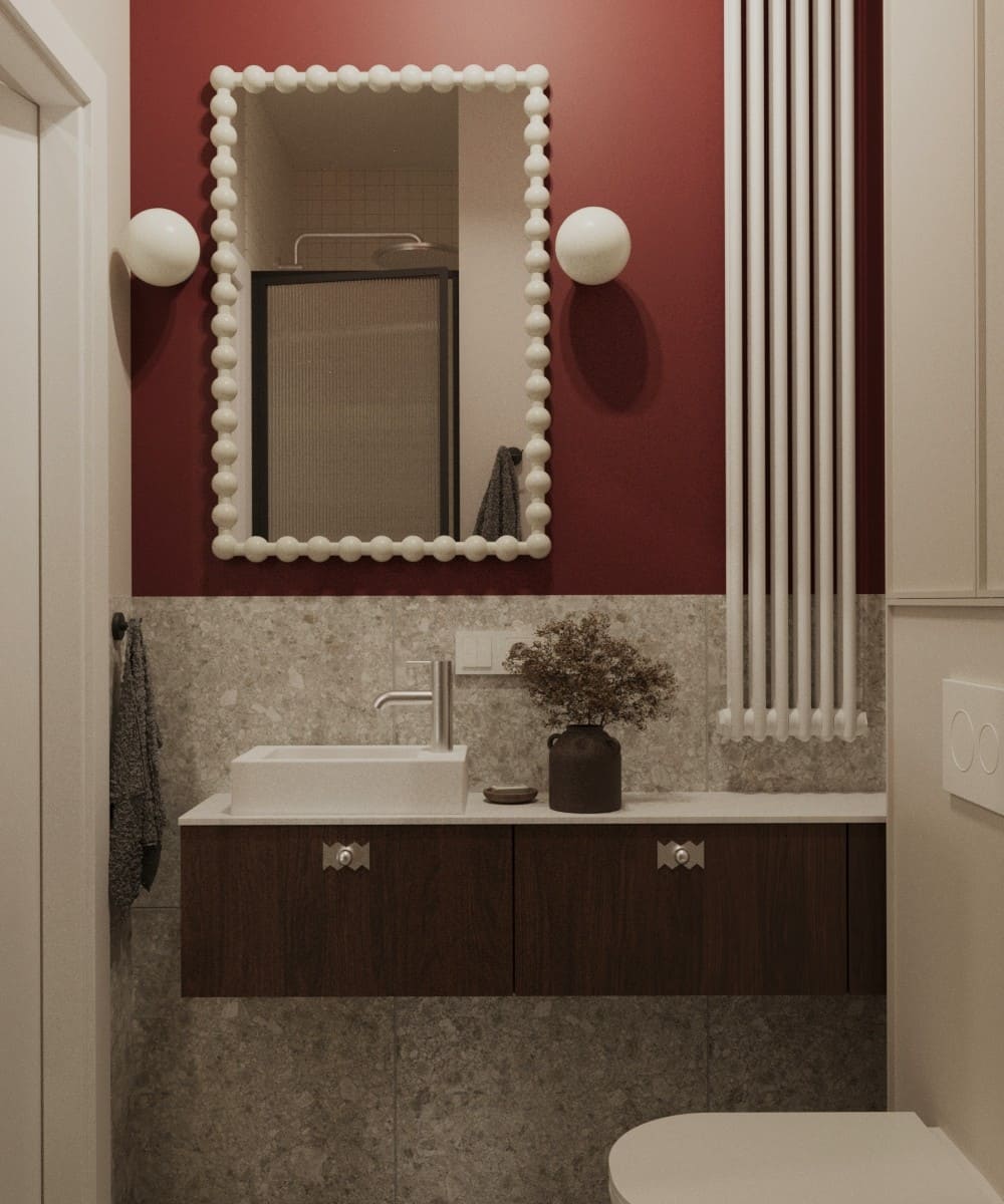 Projekt mieszkania dla młodego małżeństwa — odważne formy i kształty, ponadczasowa kolorystyka i wnętrze pełne wyrazu. To projekt, który osobiście pokochałam; ma w sobie coś, co przyciąga uwagę i sprawia, że trudno oderwać od niego wzrok. Mimo zastosowania wielu kolorów, przestrzeń pozostaje harmonijna i uporządkowana. To projekt, który w pełni oddaje swoją wartość — połączenie dobrego gustu z odwagą w aranżacji.