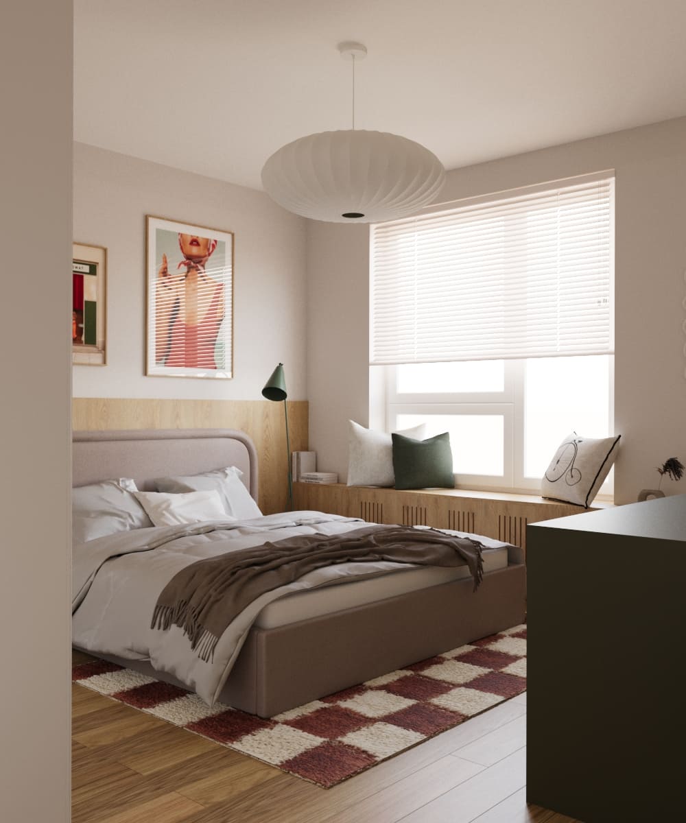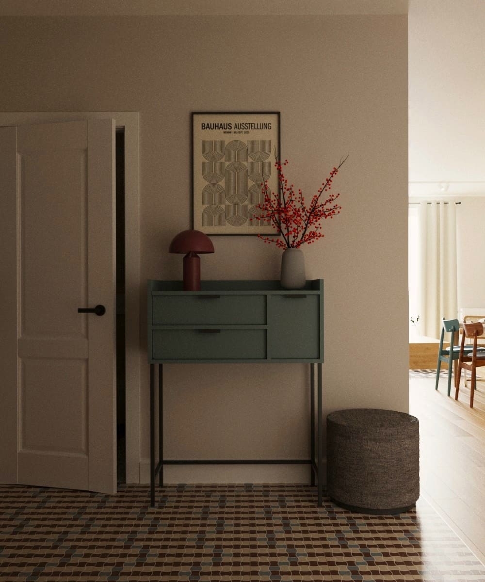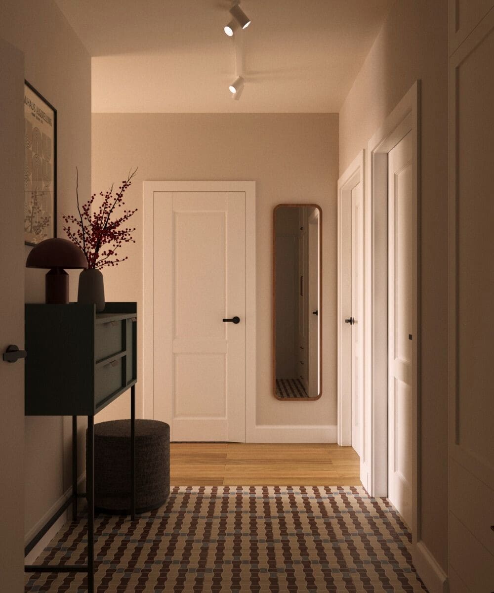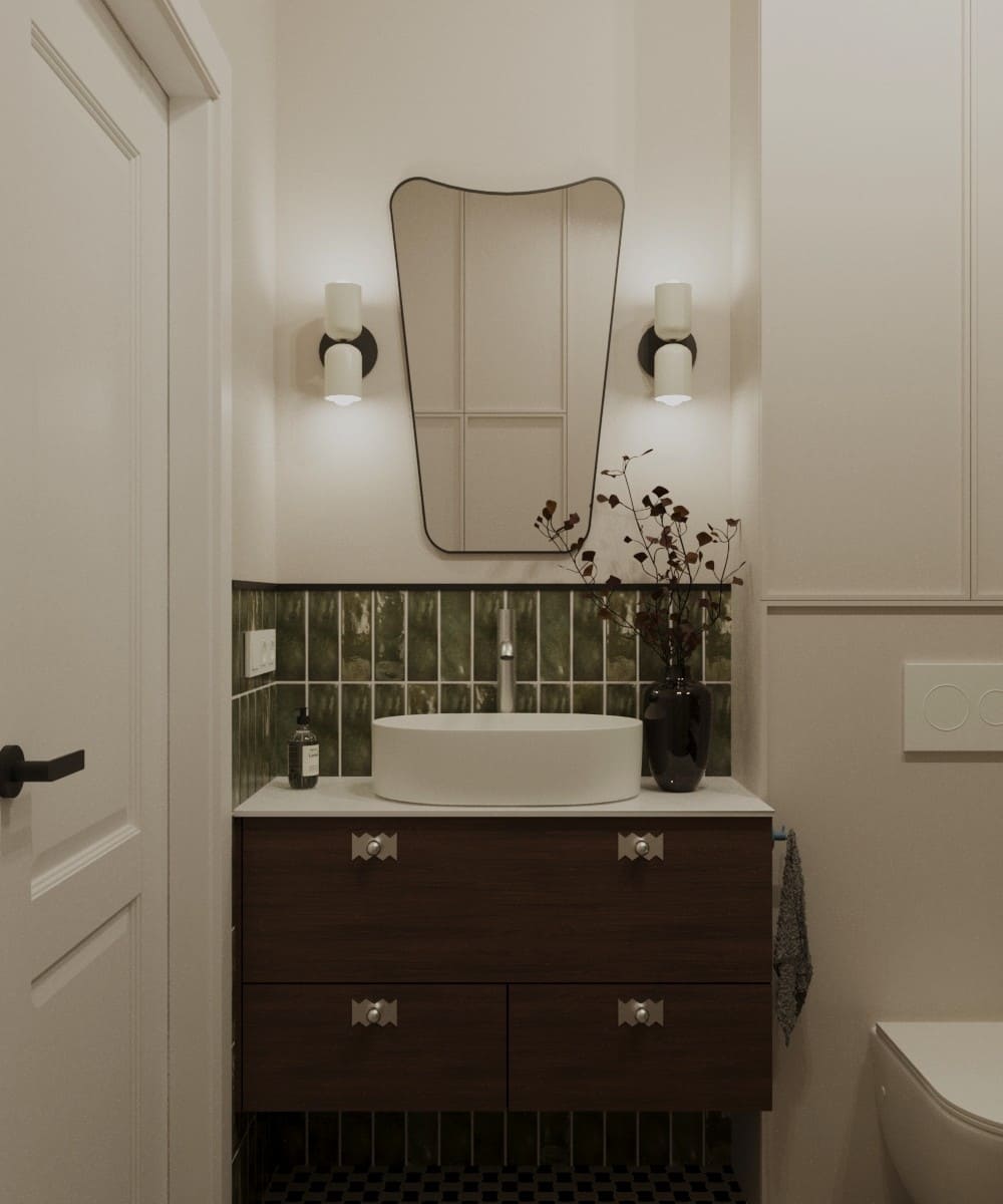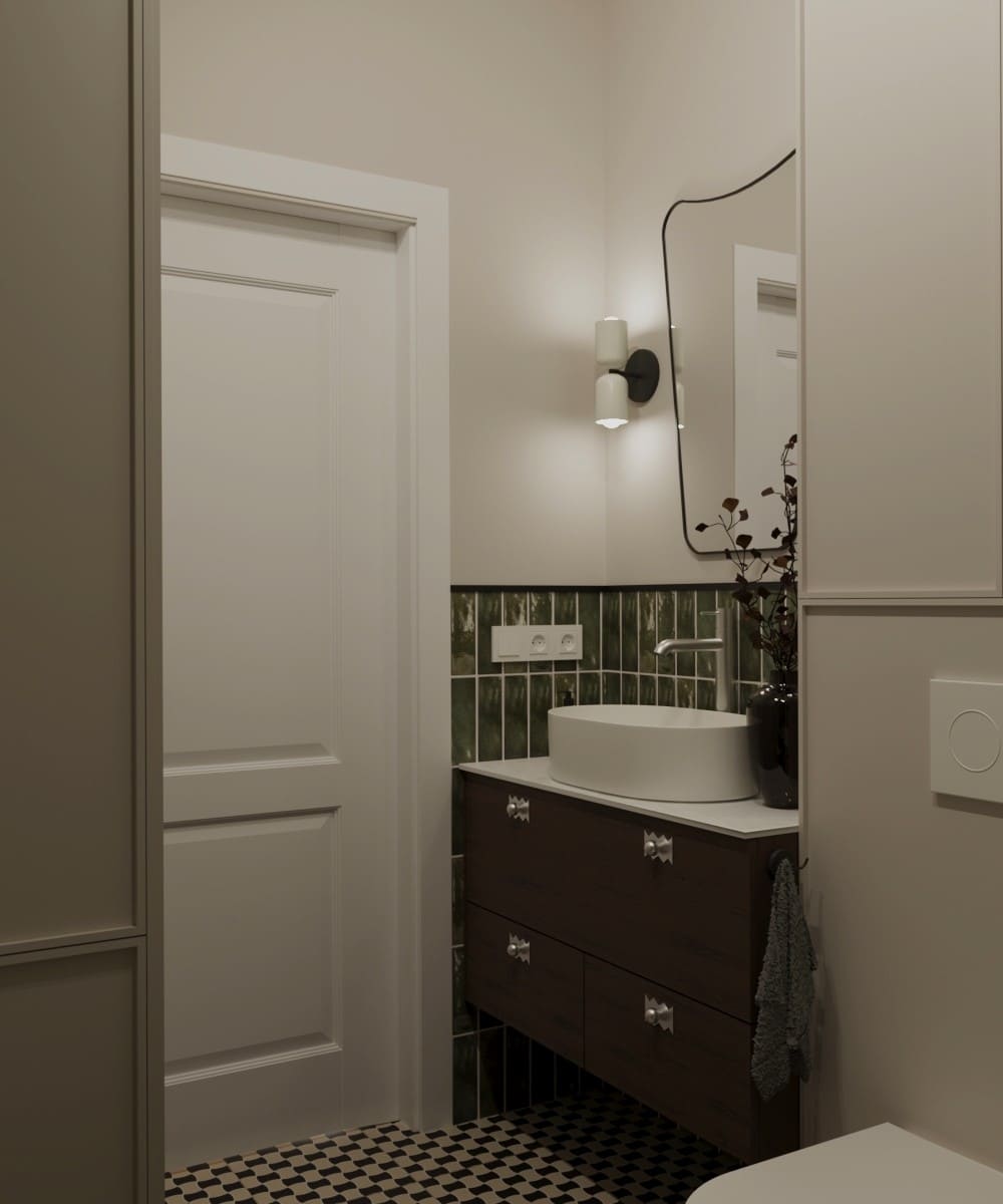 Projekt mieszkania dla młodego małżeństwa — odważne formy i kształty, ponadczasowa kolorystyka i wnętrze pełne wyrazu. To projekt, który osobiście pokochałam; ma w sobie coś, co przyciąga uwagę i sprawia, że trudno oderwać od niego wzrok. Mimo zastosowania wielu kolorów, przestrzeń pozostaje harmonijna i uporządkowana. To projekt, który w pełni oddaje swoją wartość — połączenie dobrego gustu z odwagą w aranżacji.