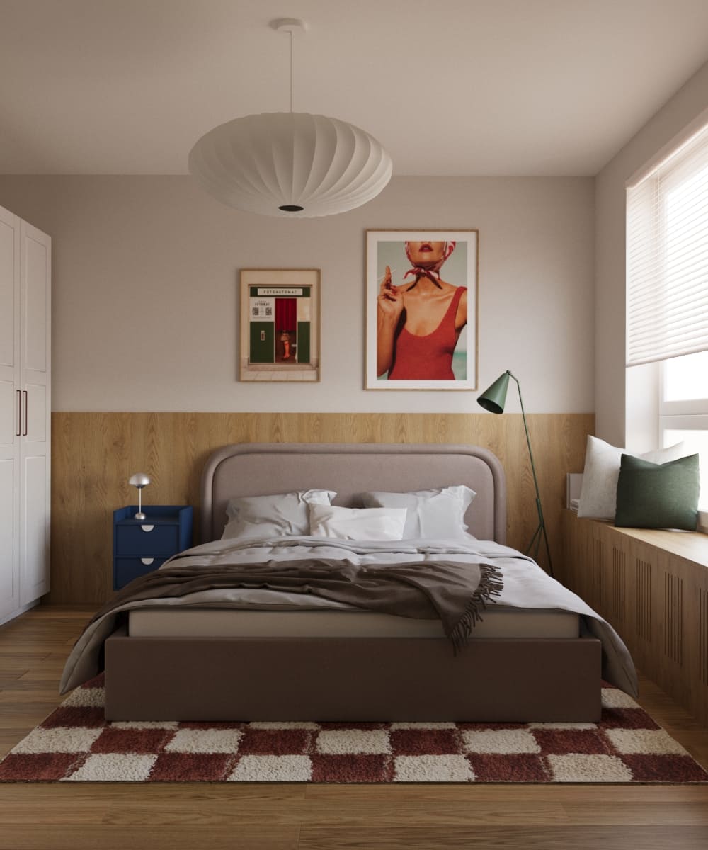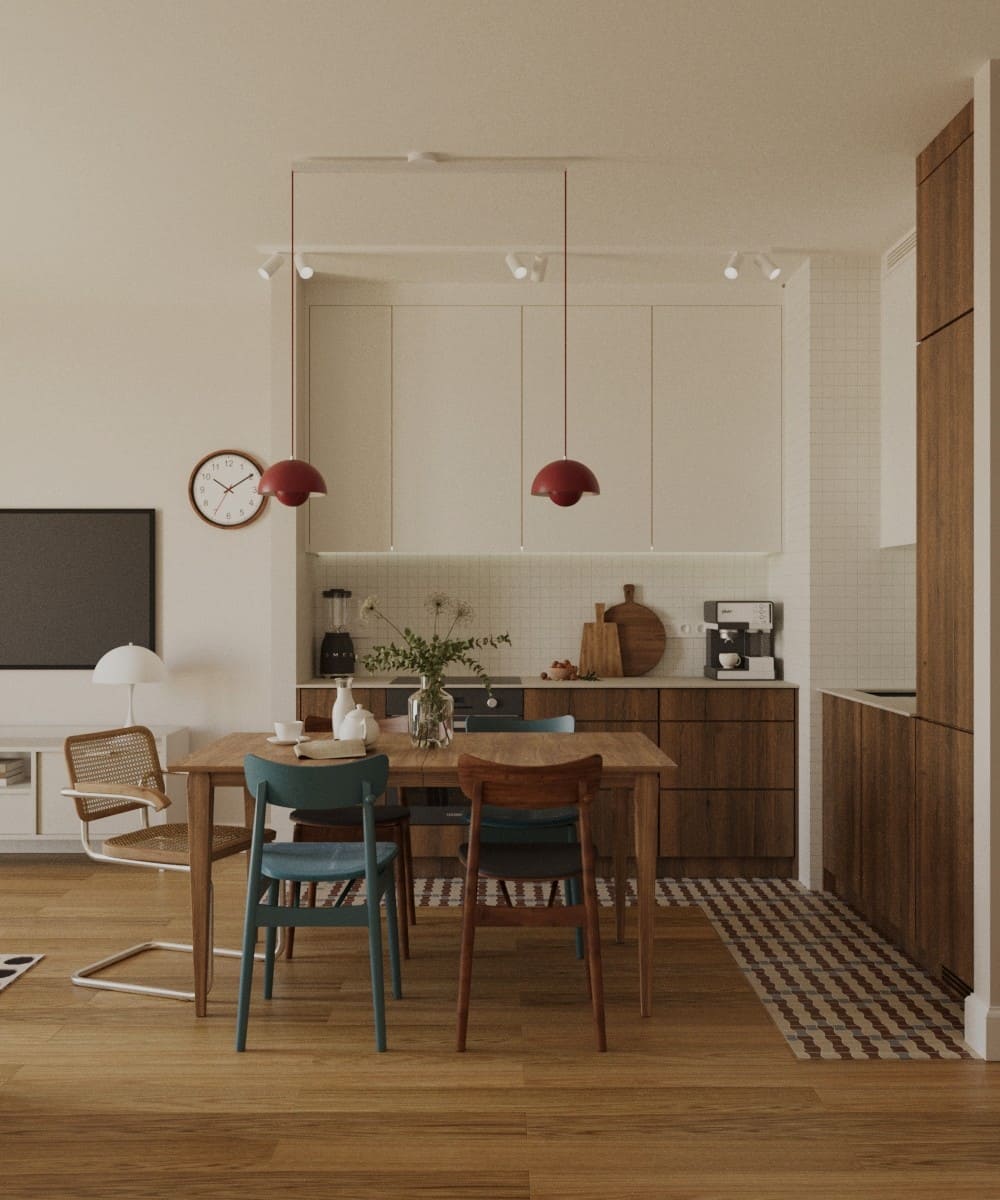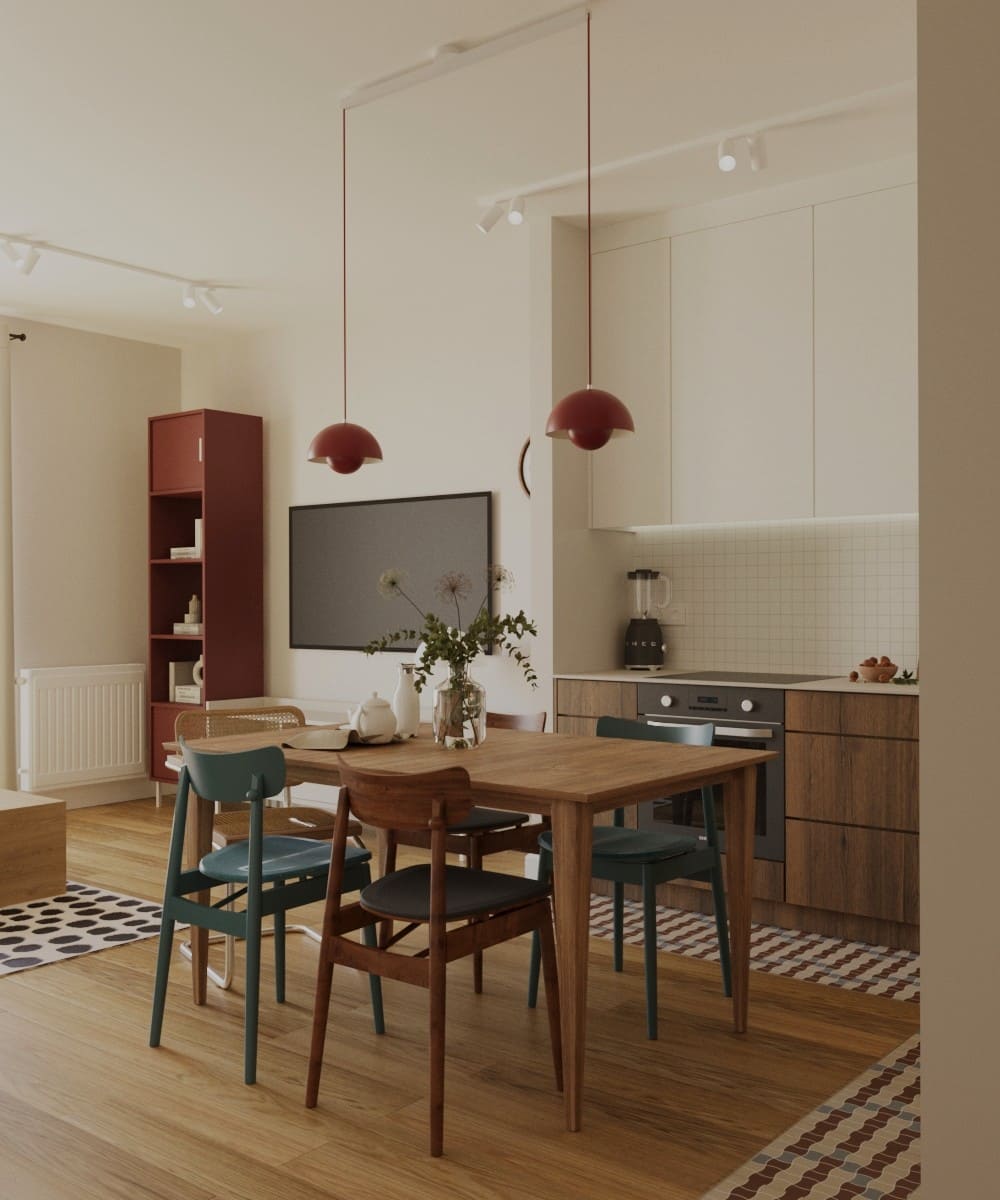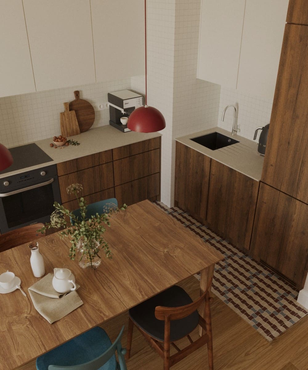 Projekt opiera się na czterech kolorach: drewnie w odcieniu vintage, bordo, zieleni i granacie. To doskonałe odzwierciedlenie czasów modernistycznych, w których te barwy królowały. Czysta biel na ścianach i w zabudowie dopełnia całość, nie wprowadzając dodatkowych kolorów, dzięki czemu przestrzeń pozostaje spójna i harmonijna.