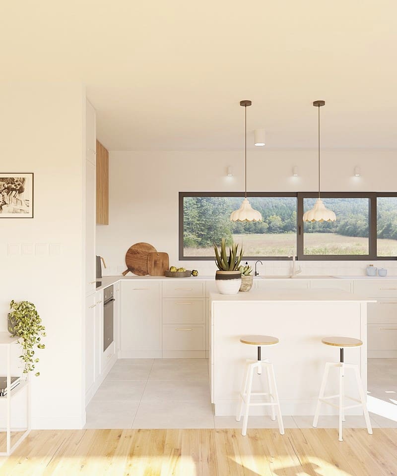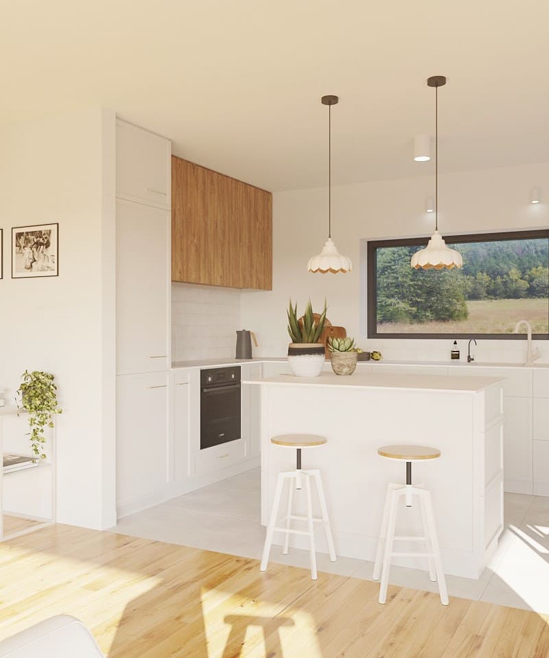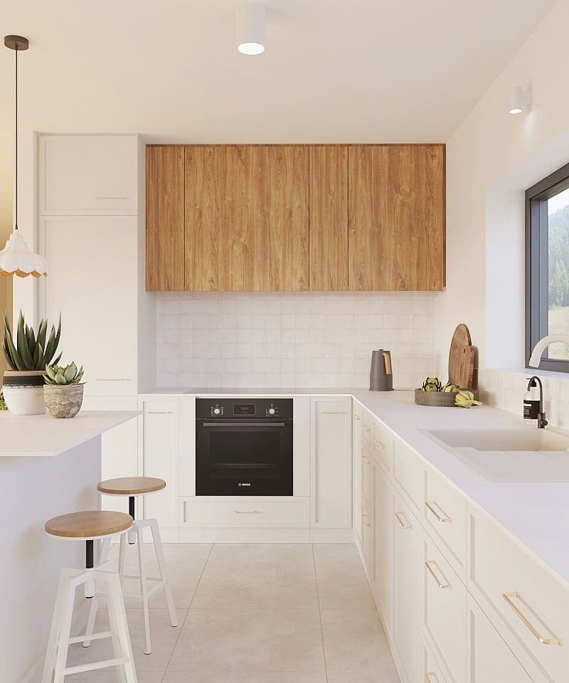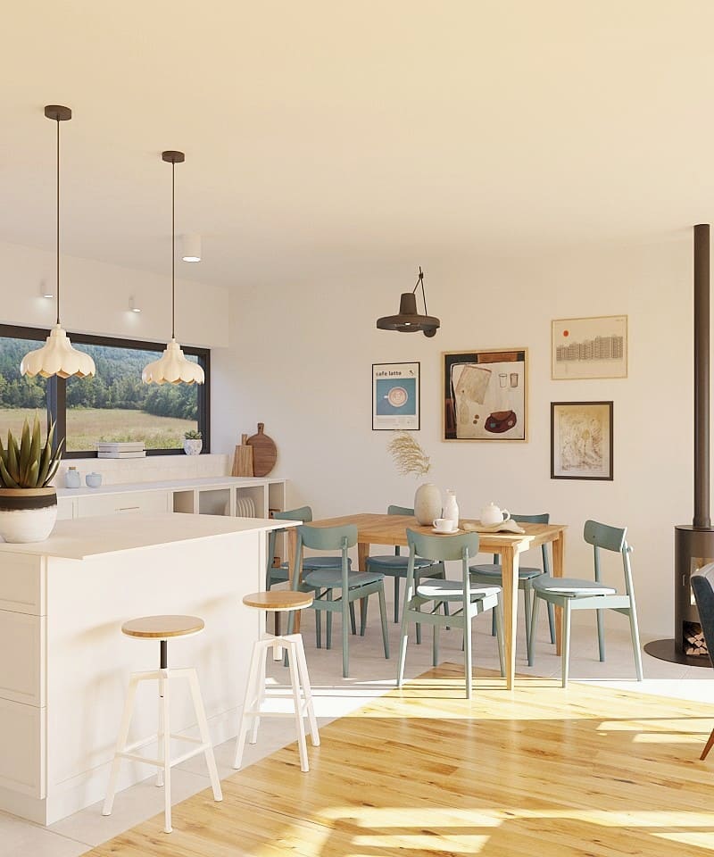 Kolorystyka projektu opiera się na jasnych, stonowanych barwach, uzupełnionych wiszącymi meblami w wykończeniu drewnopodobnym. Wyrazistym akcentem kolorystycznym są solidnie wykonane krzesła marki Fameg, które harmonijnie nawiązują do już istniejących mebli oraz stylu całego domu.