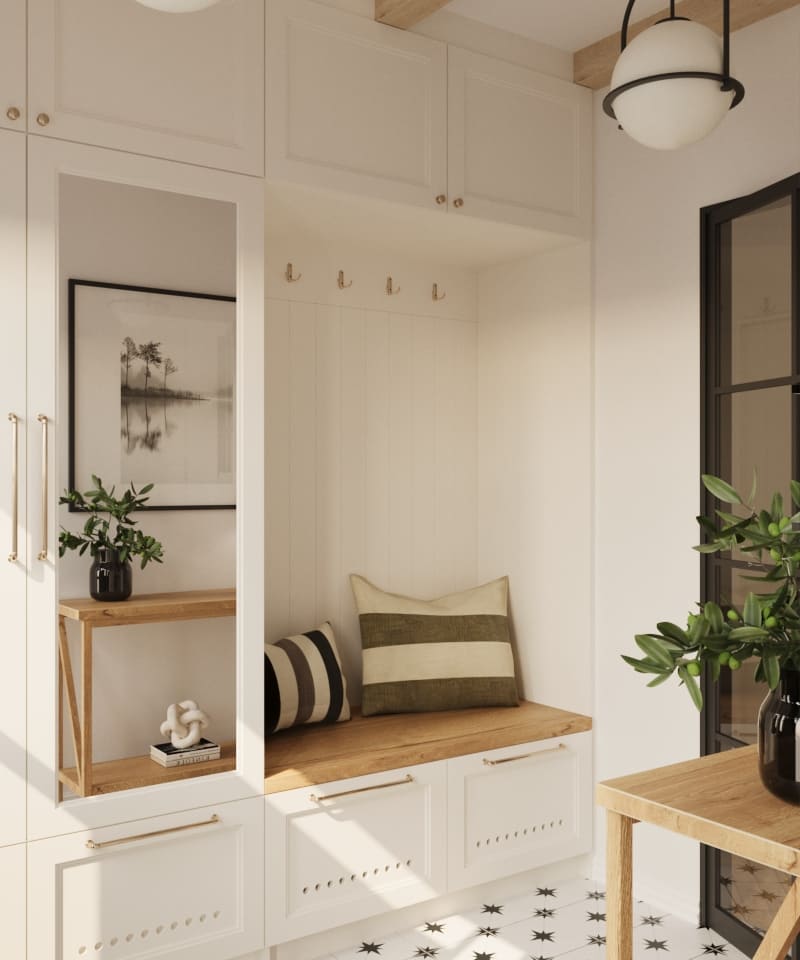 Wiatrołap w stylu farmhouse połączony ze stylem klasycznym i nutą japandi. Pojemna szafa z lustrem, siedzisko, wentylowane szuflady na buty. Perfekcyjnie zaplanowana przestrzeń z gustem i bez przepychu. Uwielbiam łączenie stylów wnętrzarskich i projektowanie pod indywidualne potrzeby moich klientów.